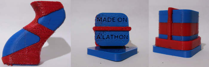 My name is Nohtal Partansky and I have created the LATHON 3D Printer. The printer has two nozzles so it can print in dual materials or dual colors. Below the blue is ABS and the red is Thermoplastic Elastomer. This are examples of the printer's ability to create overmolded prototypes.
